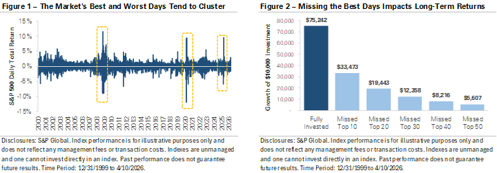 The stock market's best and worst days tend to arrive together, and the early months of 2026 offered a timely reminder. The S&P 500 fell nearly -10% from its late-January high through the end of March as the U.S.-Iran conflict sent oil prices surging more than +60%. Headlines about the Strait of Hormuz closure, rising energy costs, and the potential economic impact created an environment that can tempt investors to move to cash. But acting on that impulse would have meant missing the recovery that followed when ceasefire talks emerged in late March. It is a well-documented pattern: trying to avoid the worst days often means missing the best days.